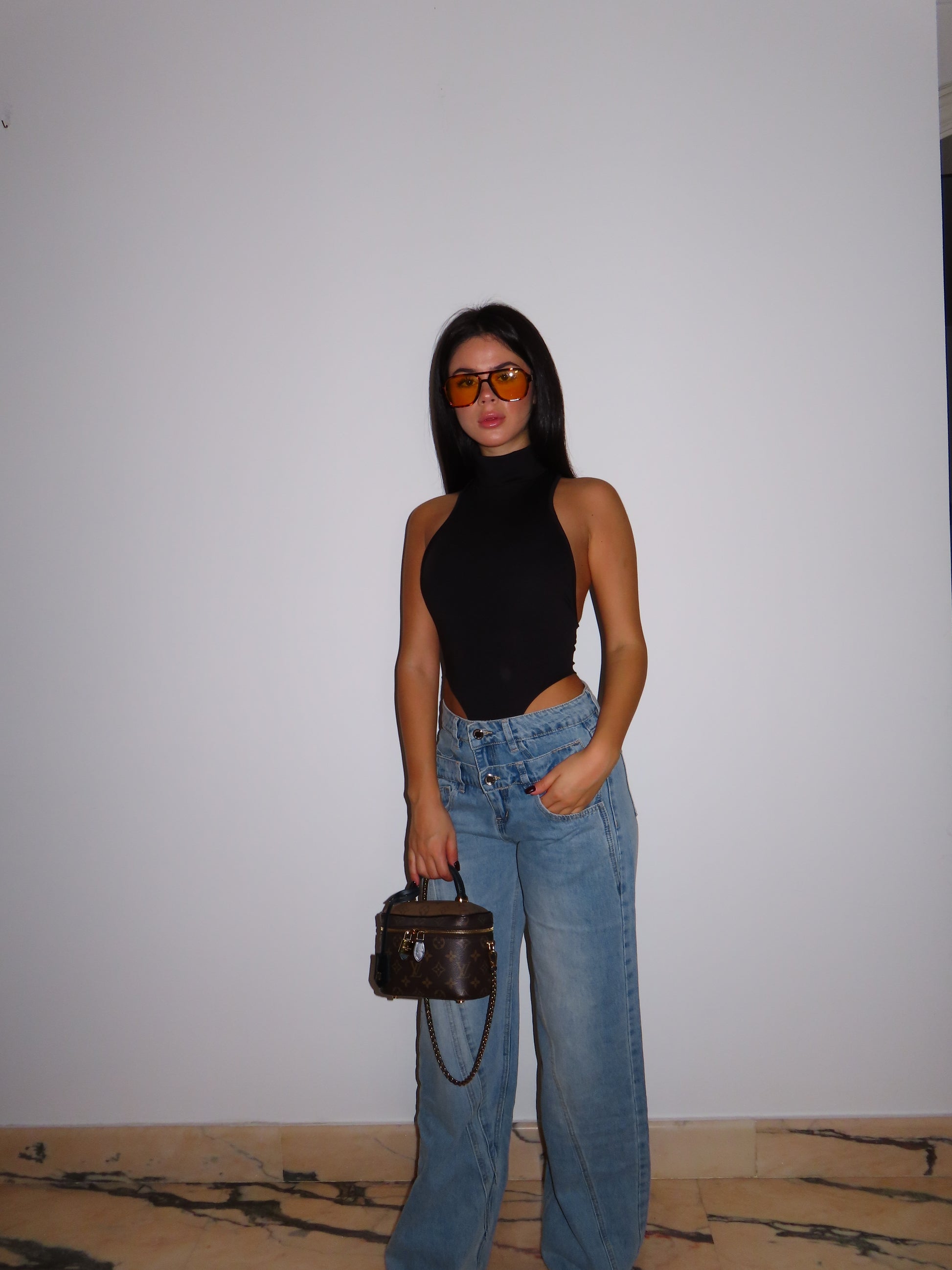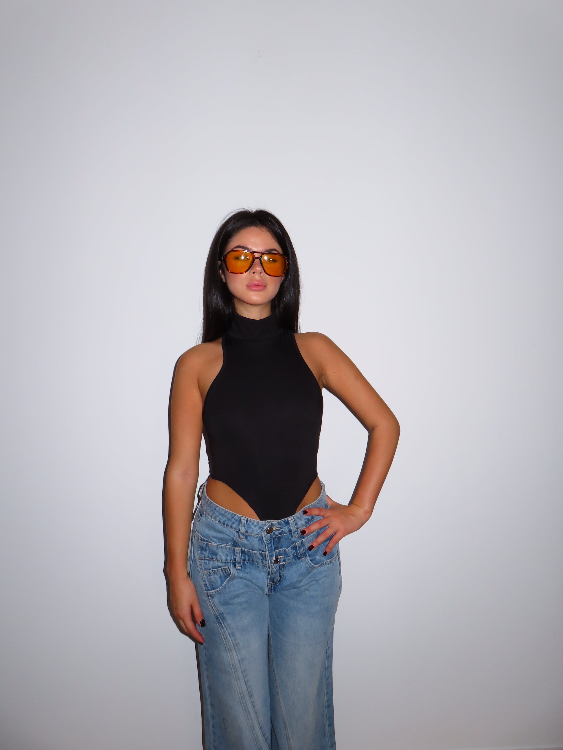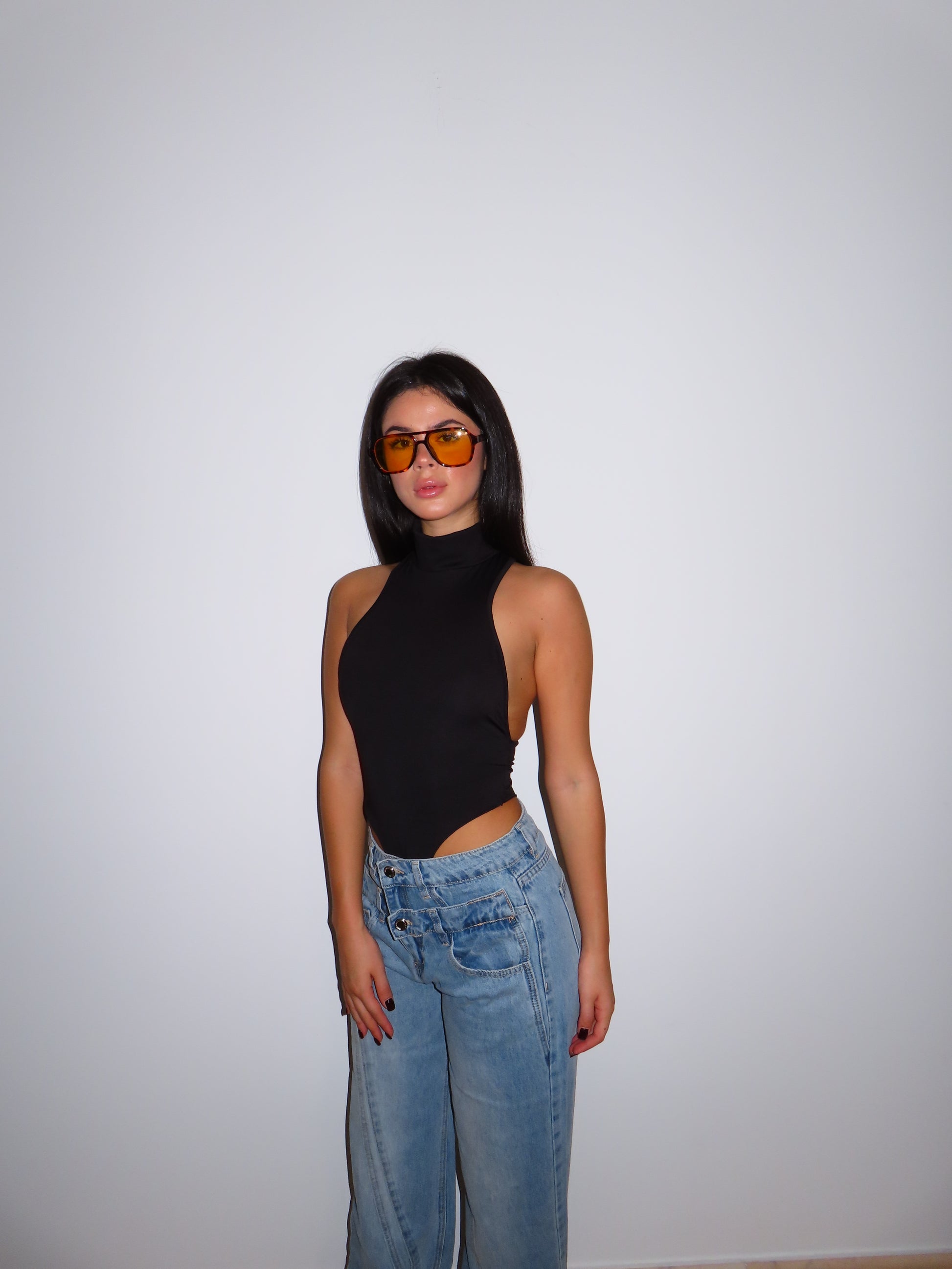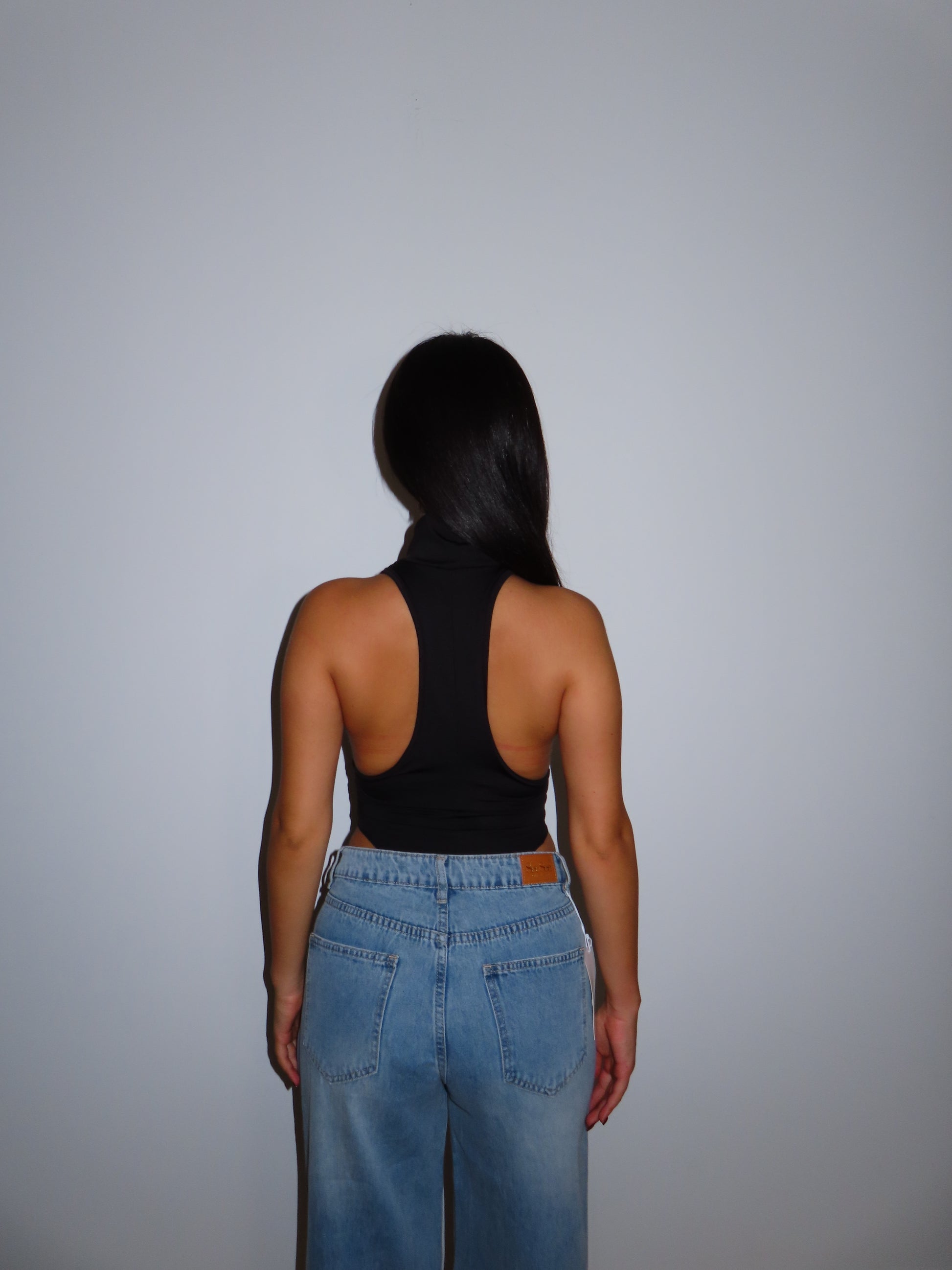 Body elasticizzato con scollo all’americana schiena scoperta e collo alto