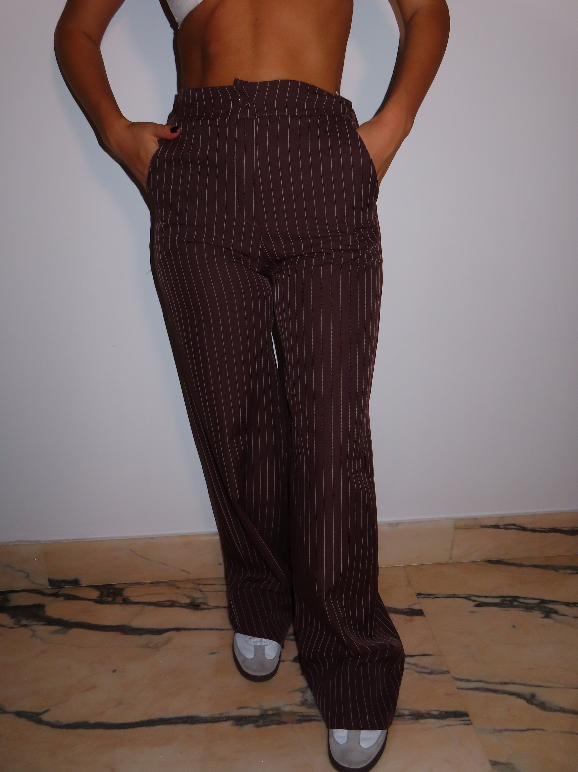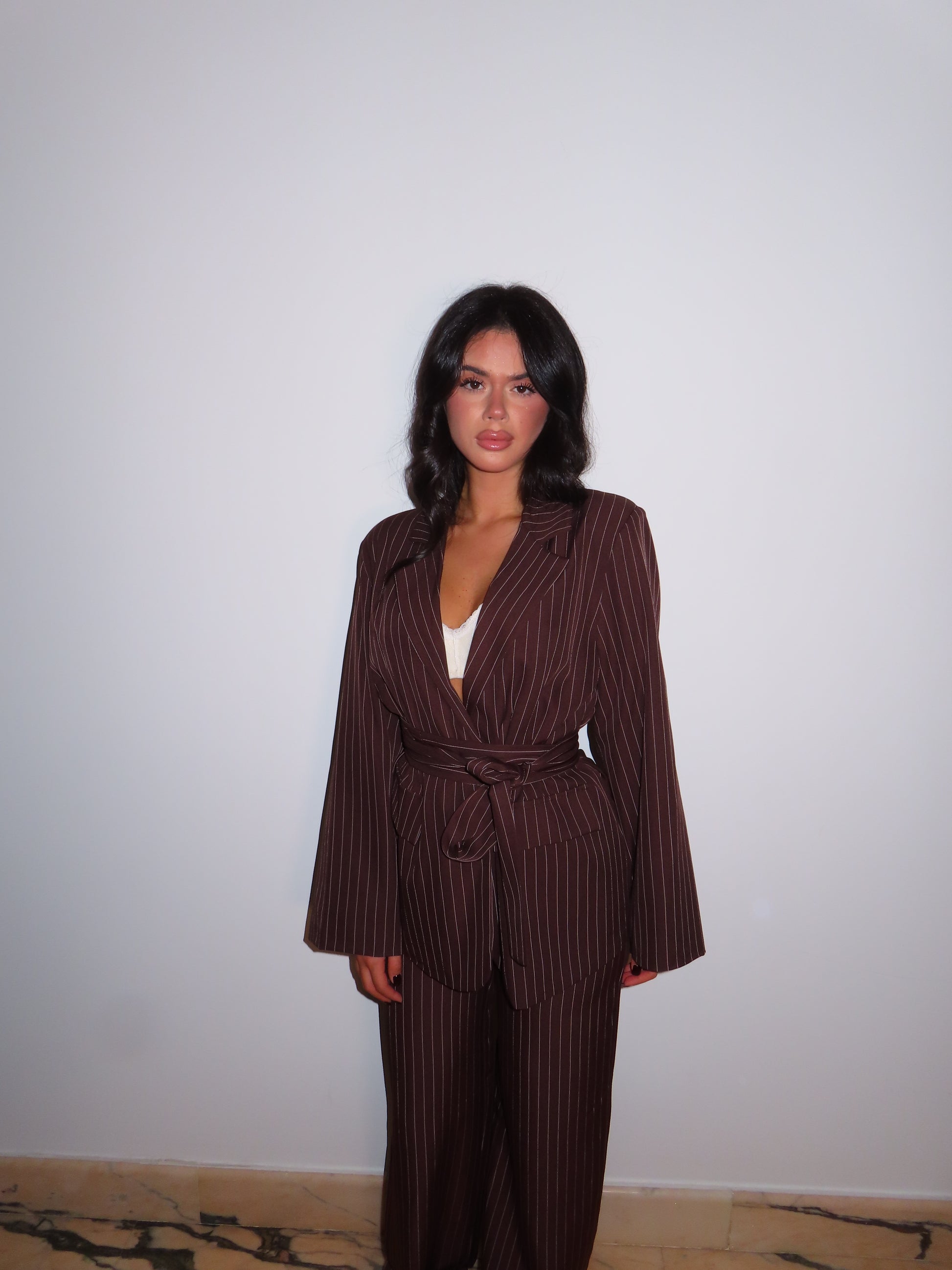 Completo elegante e versatile, composto da giacca e pantalone a righe gessate.