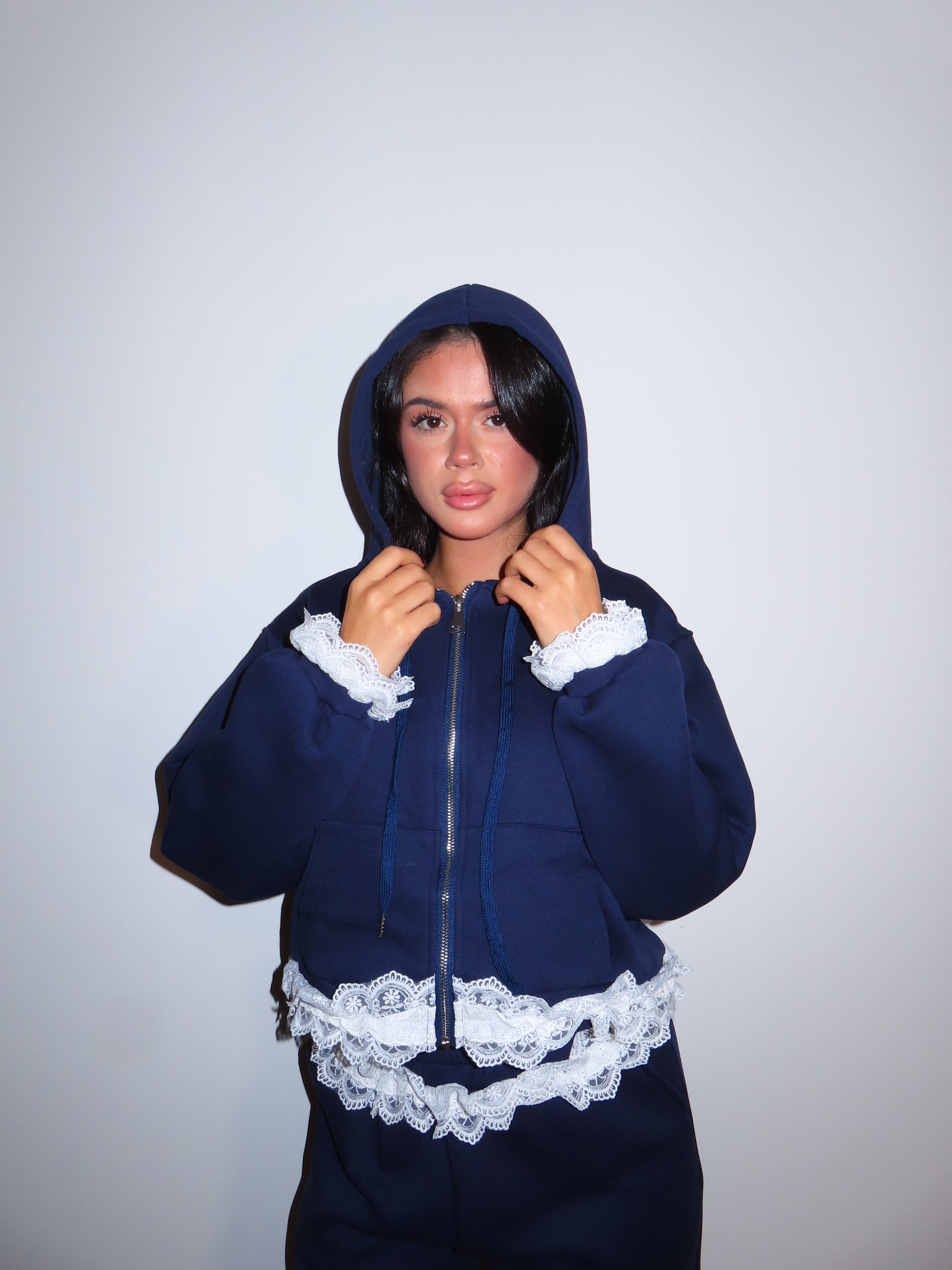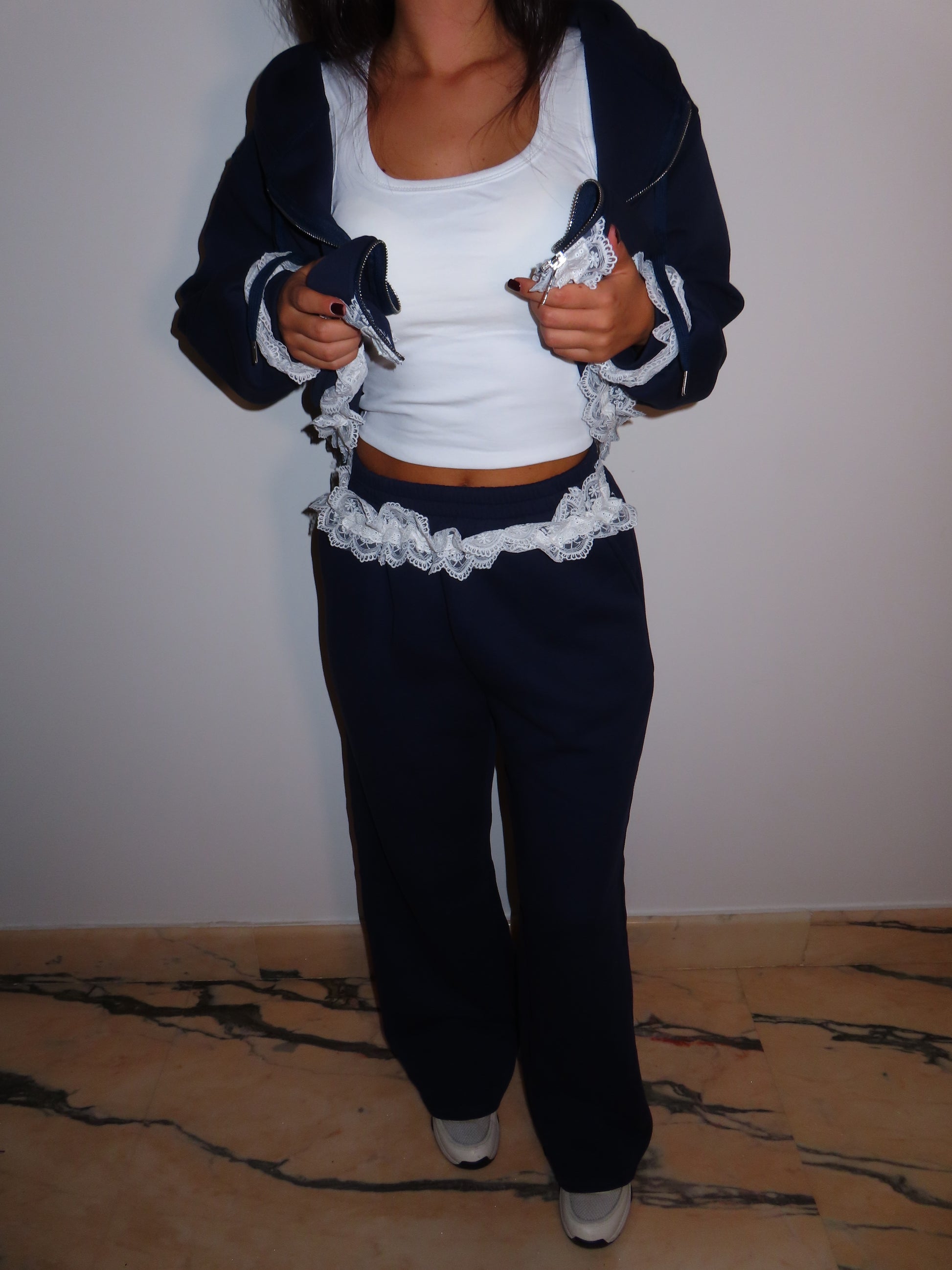 Coordinato tuta con dettagli in merletto, cappuccio, tasche e tessuto garzato (non felpato).