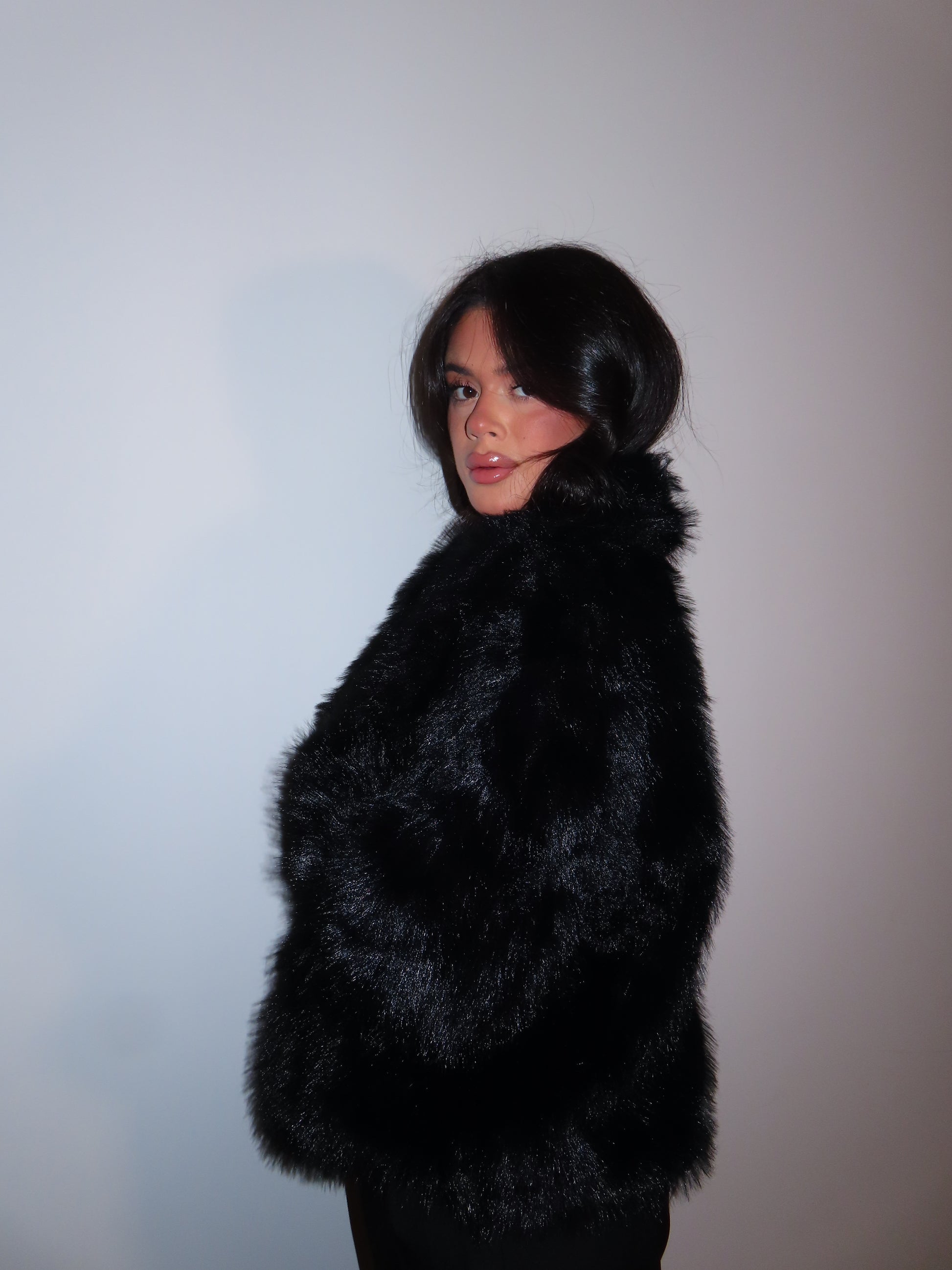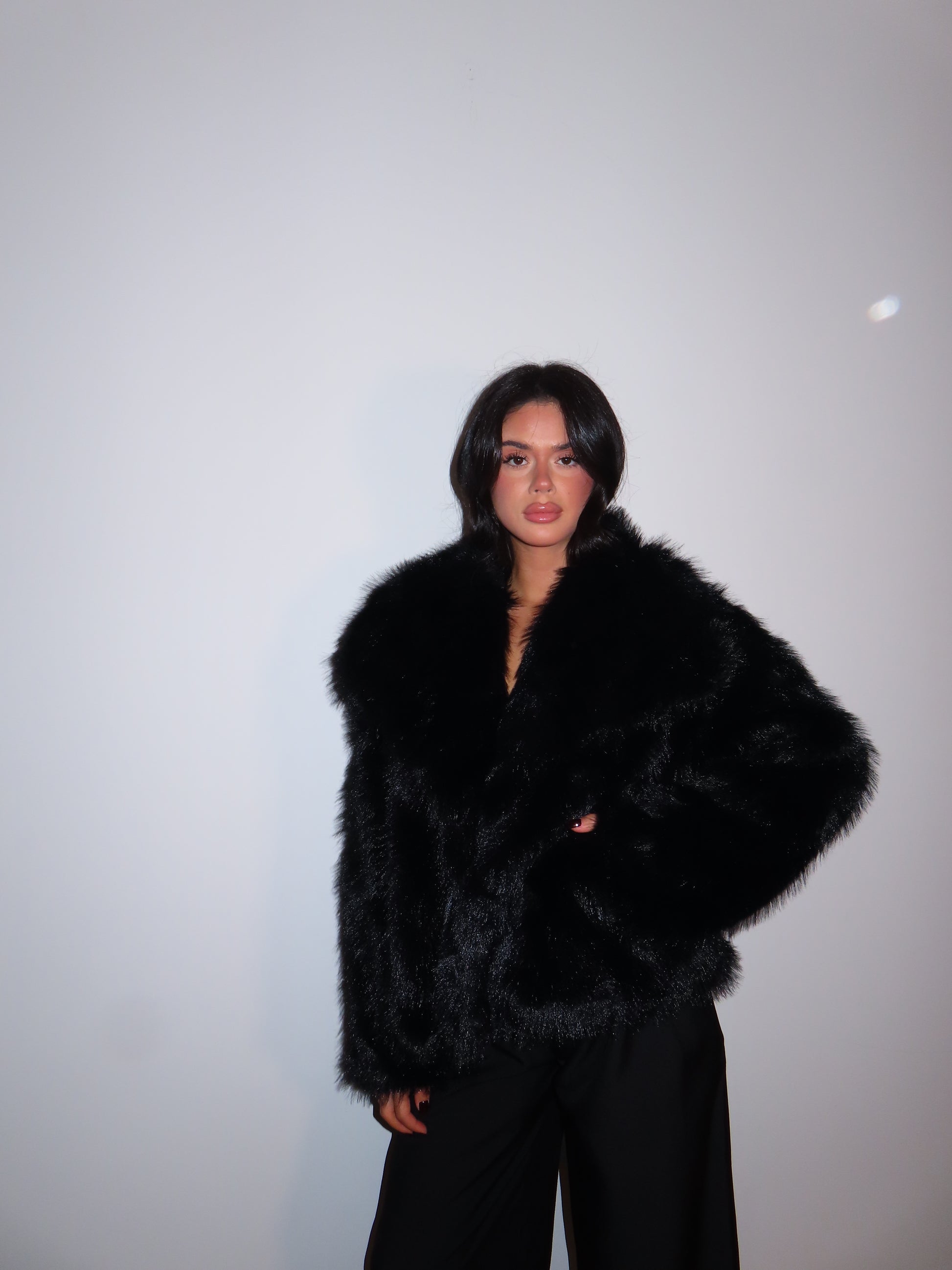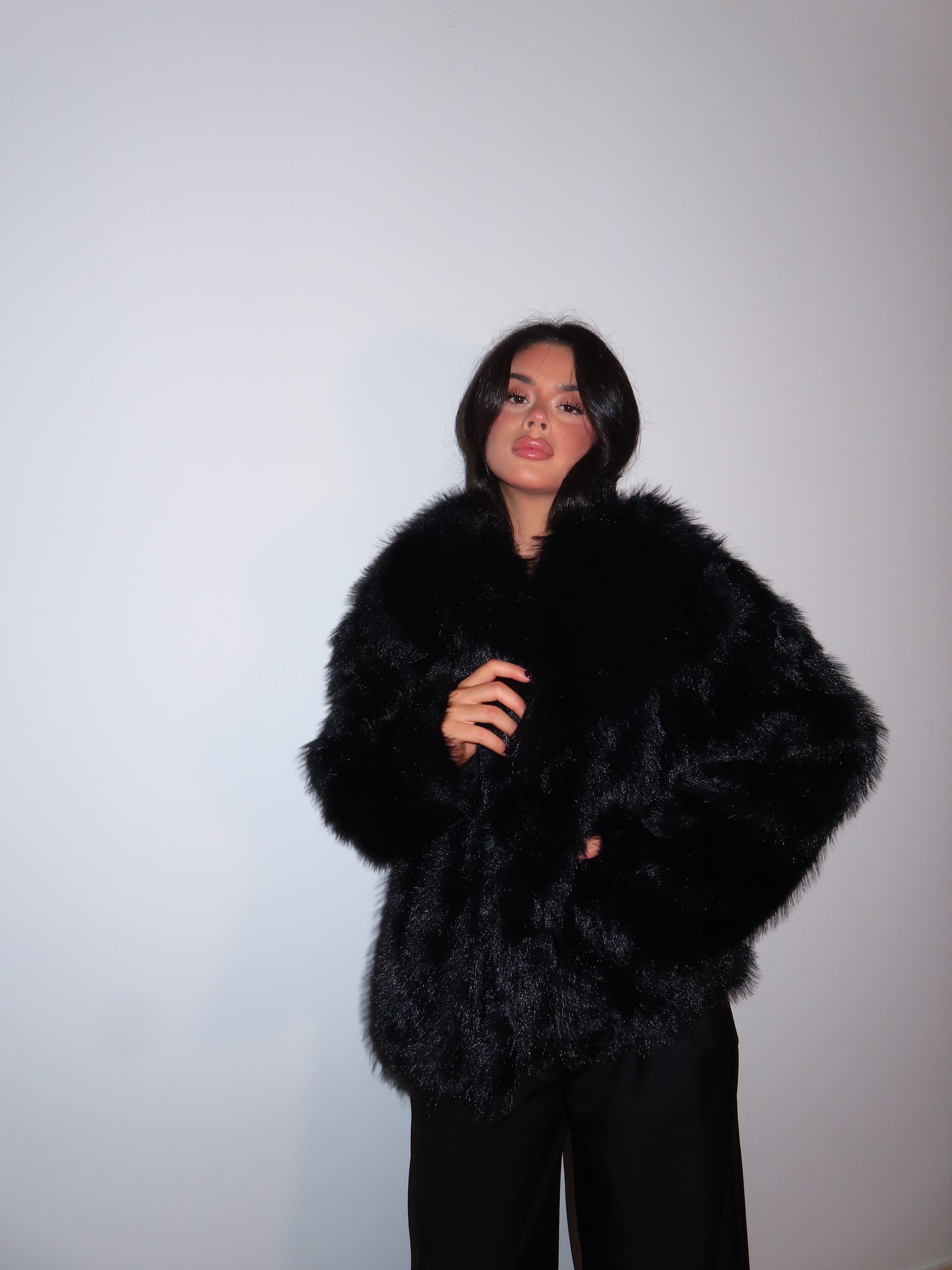 Pelliccia morbida con tasche, bavero e bottoni.