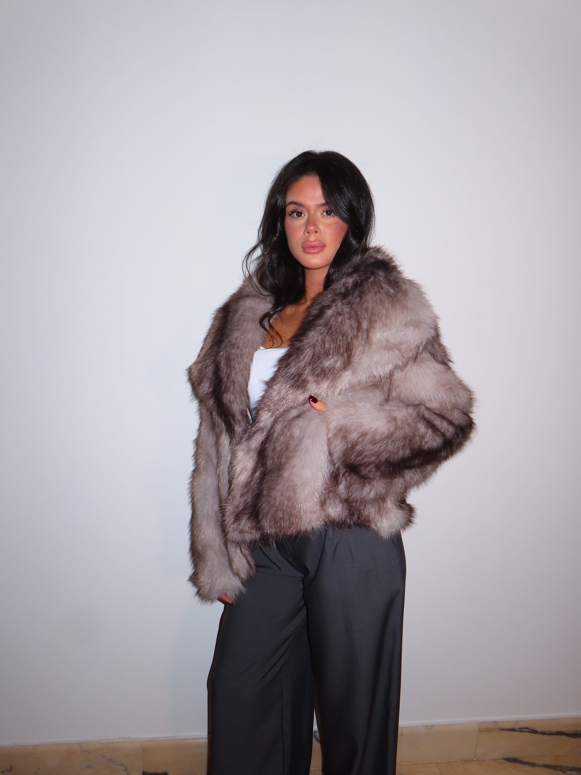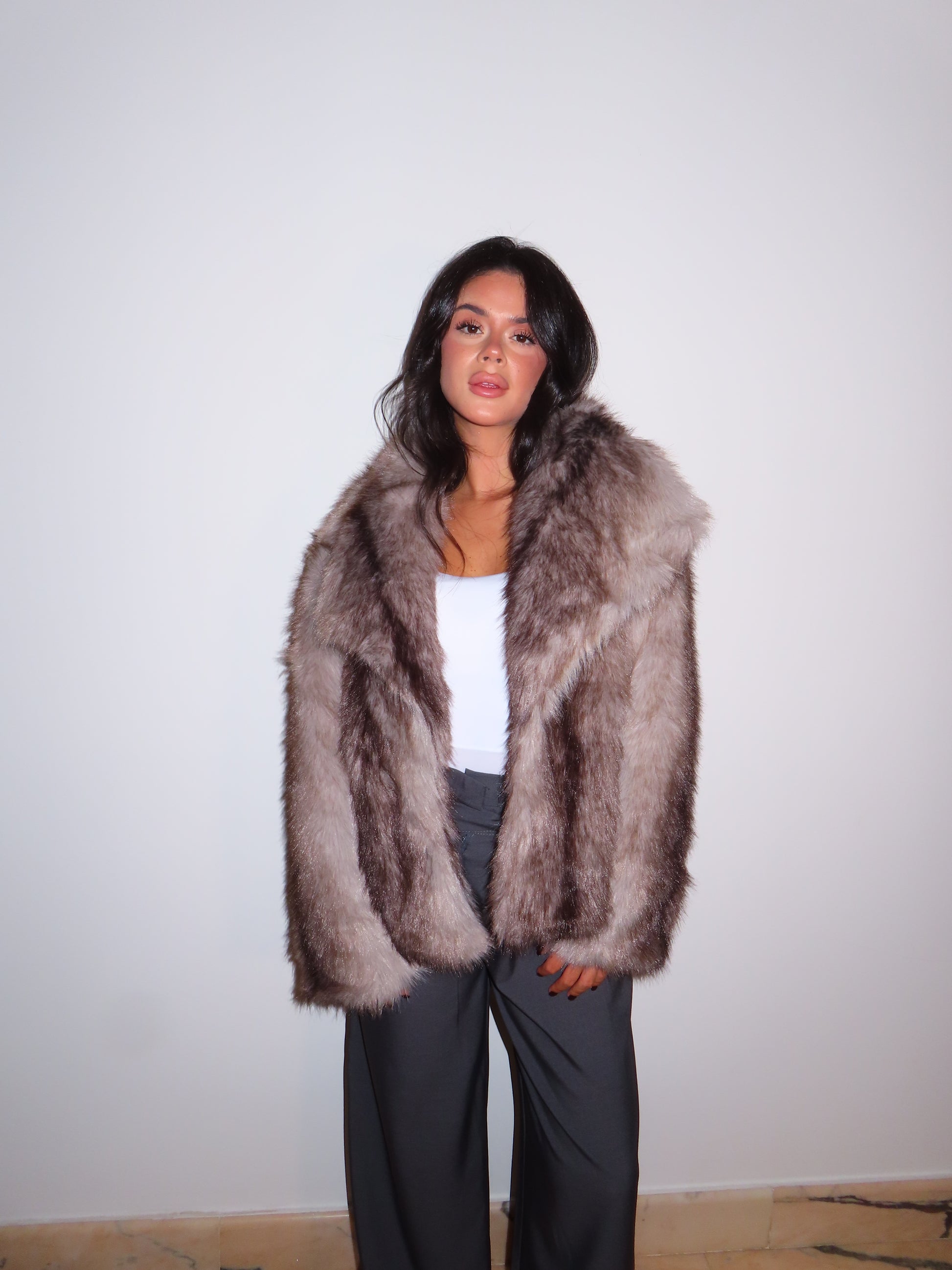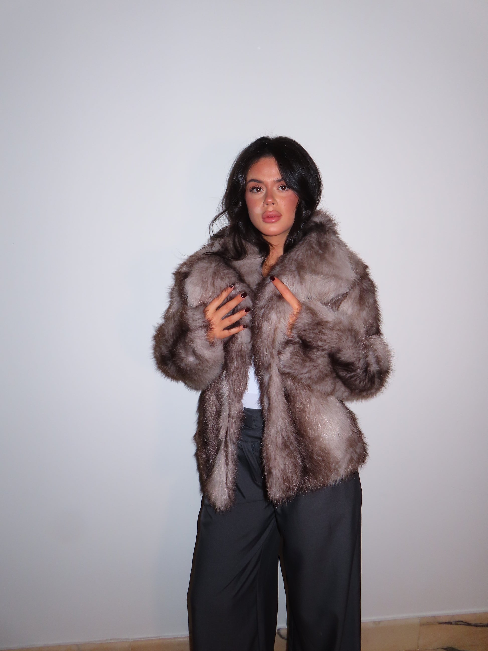 Pelliccia morbida con tasche, bavero e bottoni.