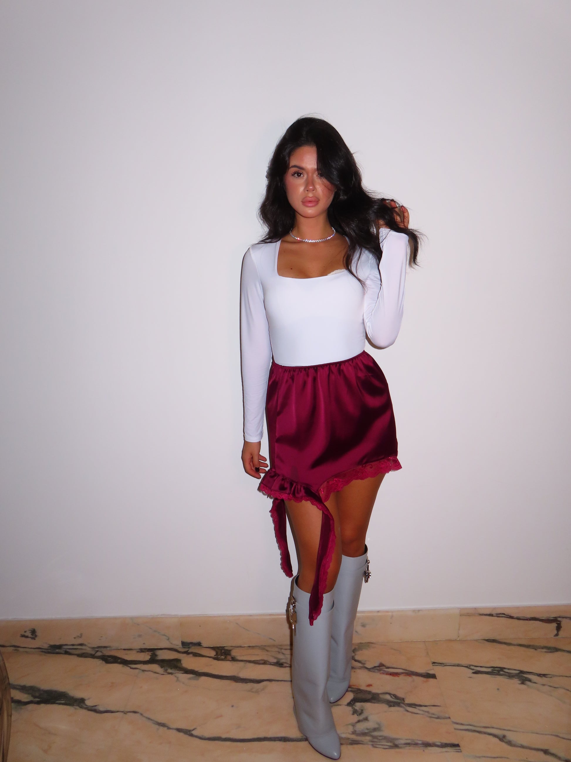 Gonna elegante e fluida in raso, morbida e luminosa.